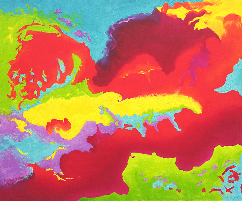 At this time I was excited with my new direction. I felt that there was a whole lot of new energy trying to come through, but it was all so new to me, and felt that I needed some loosening up in my approach to allow it to come through, but didn’t quite know how to do it. One day, I was in the bookstore, and I ran accross a book called "Life, Paint and Passion"; how to let go and create from your subconscious. It practically leaped off the shelf and said "Margaret! This is for you!!" So I brought it home and read it immediately, and experimented with letting images flow out. Or just forgetting about making "images" - just play with color. This painting is the first abstract. It was very novel to me to be doing abstract painting - if I wasn’t shown this new direction, I would be a realist painter painting landscapes, figures and still-lifes, and always thought that if I ever was to do abstracts, I would never be taken as seriously as I needed to be. So I had a lot of expectations to give up to do this. With this painting, the floodgates of creativity burst opened, and I could see an endless well of imagery that was there for me. It gave me such a great sense of peace. |
