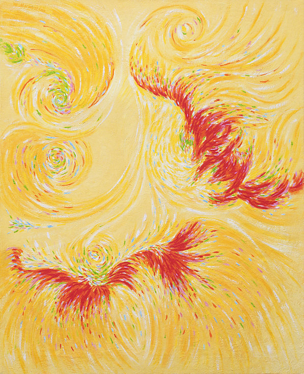 I had seen an image that had a particular creamy-yellow background with reddish objects, and it really haunted me for some reason. I decided to start with these colors, but I got a little lost when I started putting the reds on after I had the yellow background. So I walked away, and when I soon returned to it, I started to get "instructions". I got the name of the painting, and could feel a happy bubbliness and saw the heavens filled with joy, laughter and parties. They really do have a good time up there. The instructions included, again, to put the paint on as colored spots. I really felt like I was in an art class. This was a whole new way and direction of painting for me. It was a joy to do and went very smoothly. I don't think I ended up with my original color idea, but it was a starting point.